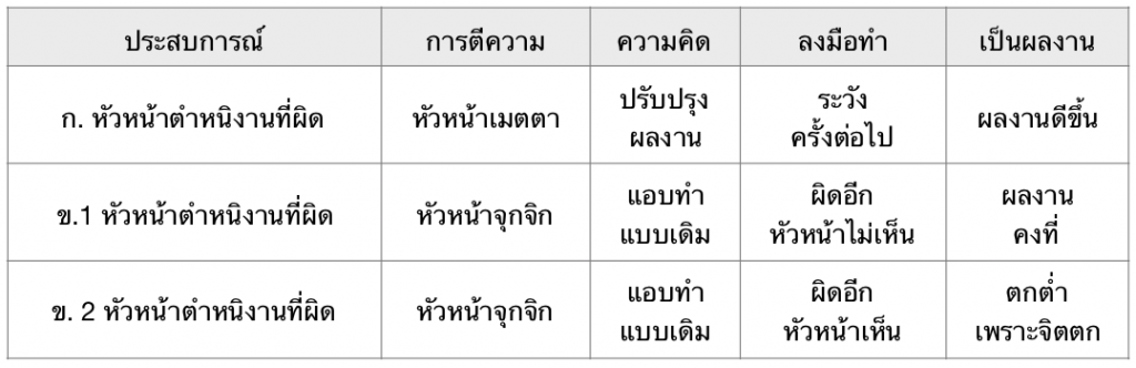 การตีความของเขา ส่งผลให้ความคิดลบ สู่การลงมือทำที่ลบ แต่ว่าคราวนี้หัวหน้าเห็นว่าเขาทำผิด
