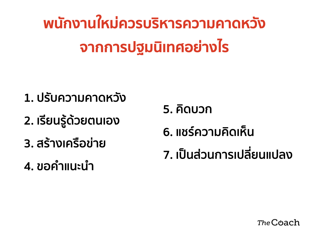 การปฐมนิเทศในองค์กรเป็นขั้นตอนที่สำคัญและส่งผลต่อความรู้สึกและความคาดหวังของพนักงานใหม่ในระยะยาวอย่างแน่นอน ในบริบทที่องค์กรไม่มีระบบการปฐมนิเทศที่ดี หรืออาจจะมีแต่ไม่ค่อยเป็นระบบ มีหลายวิธีที่พนักงานใหม่สามารถบริหารความคาดหวังและคิดบวกได้:
