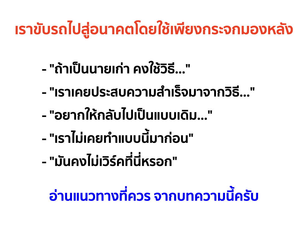 มาร์แชล แมคลูฮาน นักทฤษฎีสื่อชื่อดังเคยกล่าวไว้ว่า “เราขับรถไปสู่อนาคตโดยใช้เพียงกระจกมองหลัง” คำกล่าวนี้สะท้อนให้เห็นถึงพฤติกรรมของคนจำนวนมากที่ยึดติดกับอดีตและประสบการณ์เดิม แม้ว่ากำลังเผชิญกับสถานการณ์และบริบทใหม่ ๆ
