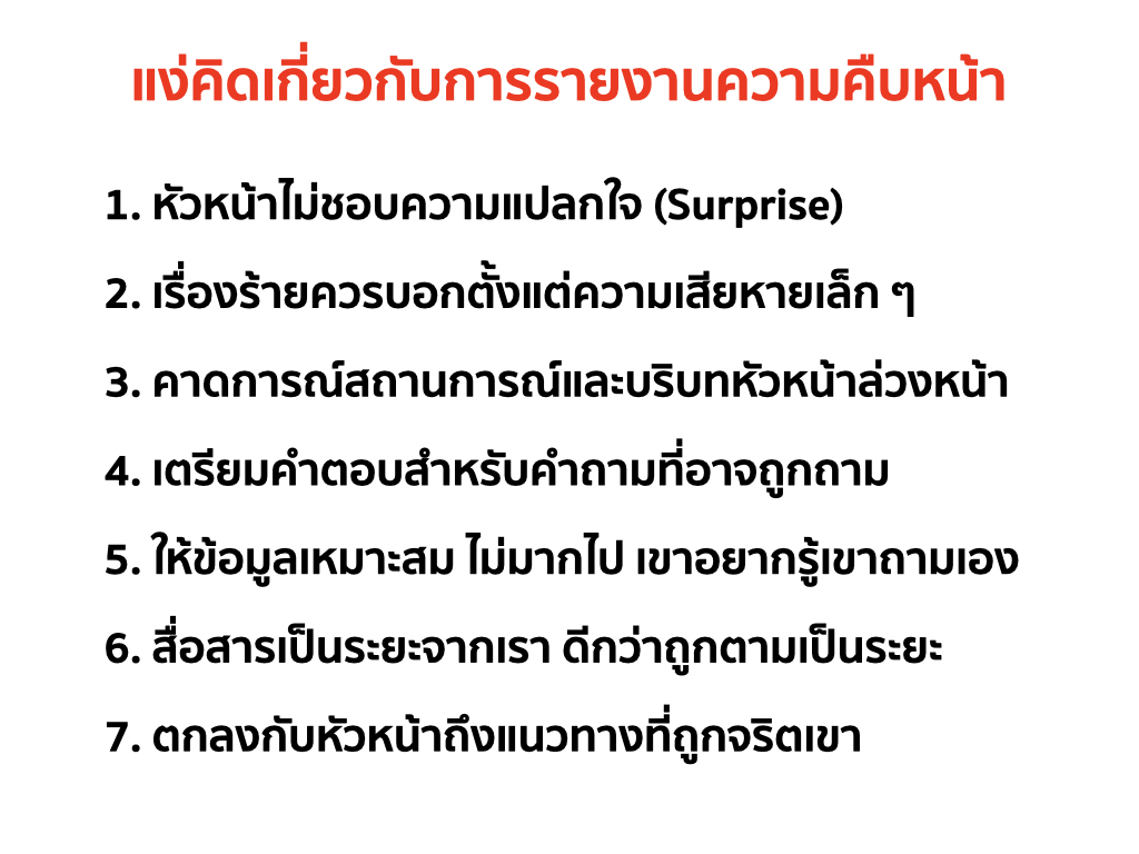 หัวหน้ามักไม่ชอบ surprises การรายงานความคืบหน้าควรเป็นการอัปเดตสถานการณ์งานตามปกติ ไม่ควรมีเรื่องที่หัวหน้าไม่เคยรับรู้มาก่อน โดยเฉพาะปัญหาใหญ่ ควรแจ้งให้ทราบล่วงหน้าตั้งแต่เนิ่น ๆ เพื่อหัวหน้าได้มีเวลาเตรียมรับมือ