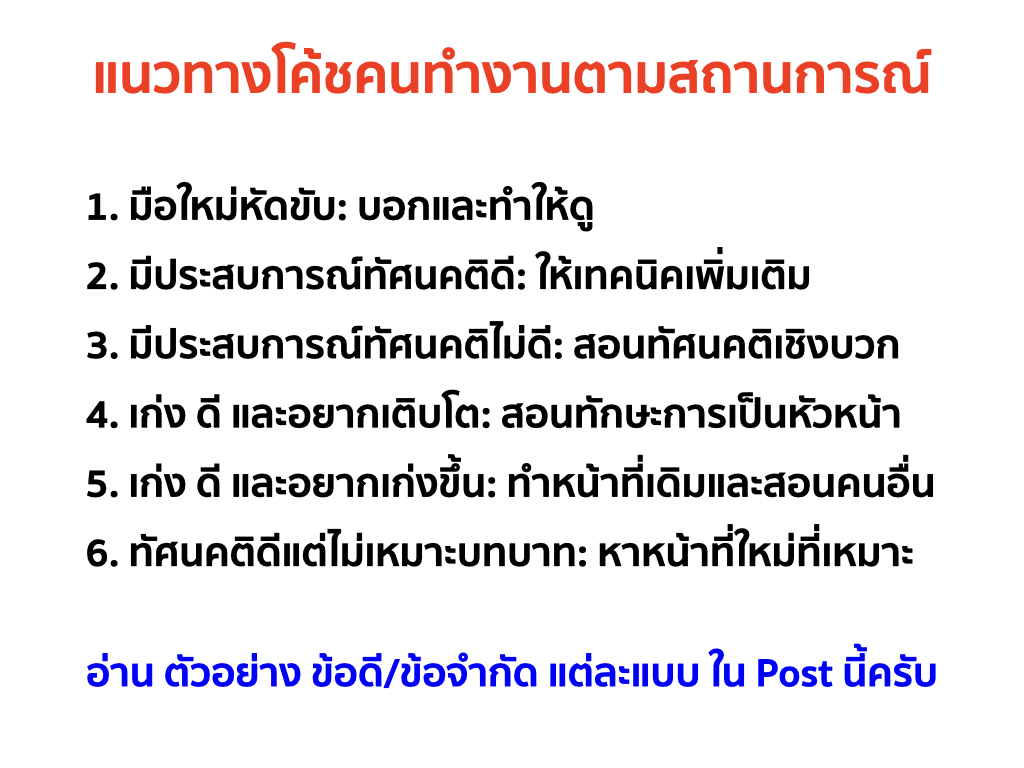 การโค้ชที่มีประสิทธิภาพนั้นขึ้นอยู่กับความสามารถของหัวหน้าในการประเมินสถานการณ์และปรับวิธีการให้เหมาะสมกับบริบทของแต่ละคน ต่อไปนี้คือแนวทางการโค้ชในสถานการณ์ต่าง ๆ พร้อมตัวอย่างประกอบ ข้อดี และข้อจำกัด: