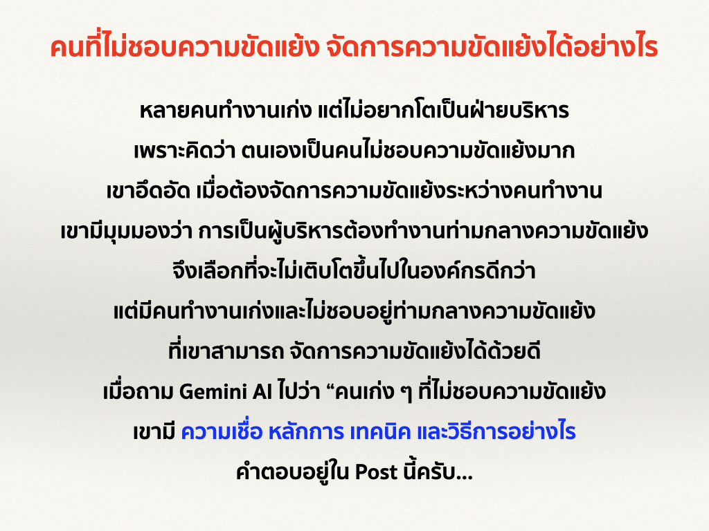 จะเห็นได้ว่า แม้จะเป็นคนที่ไม่ชอบความขัดแย้ง แต่หากมีความเข้าใจ มีหลักการ และมีเทคนิคในการจัดการ ก็สามารถจัดการกับความขัดแย้งในที่ทำงานได้อย่างมีประสิทธิภาพ และเติบโตในสายงานบริหารได้เช่นกัน