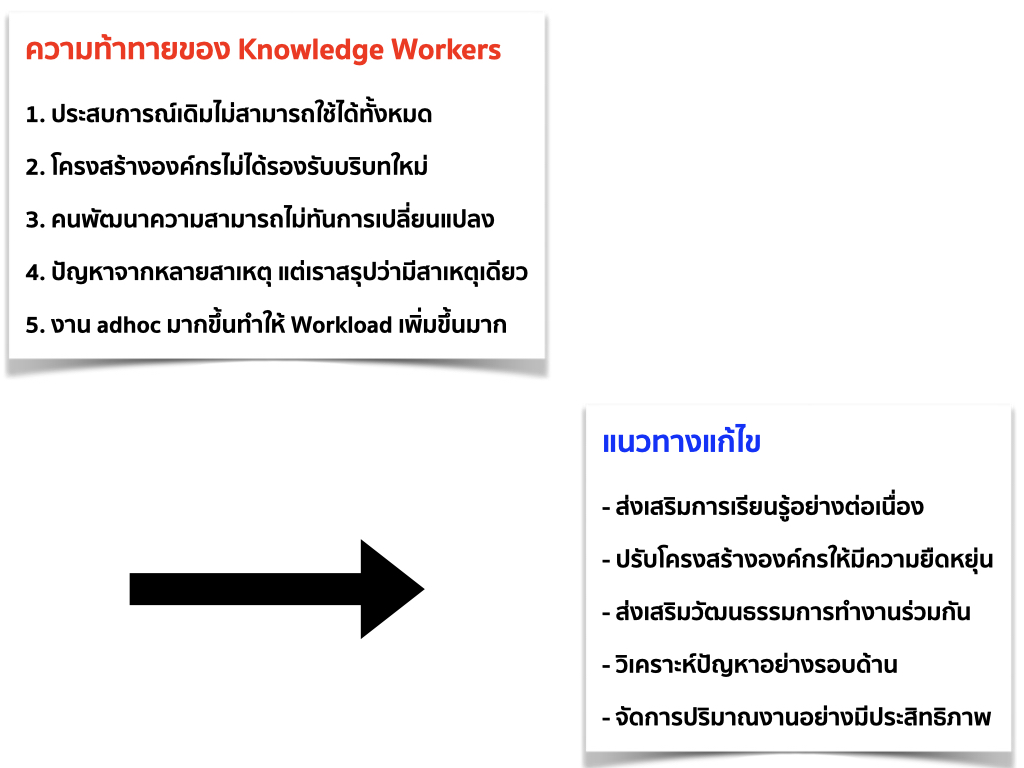 – คำอธิบาย: ในโลกที่เปลี่ยนแปลงอย่างรวดเร็ว ความรู้และประสบการณ์ที่เคยมีอาจไม่เพียงพอหรือล้าสมัยไปแล้ว ทำให้ Knowledge Workers ต้องเรียนรู้อย่างต่อเนื่องและปรับตัวให้ทันกับสถานการณ์ใหม่ ๆ