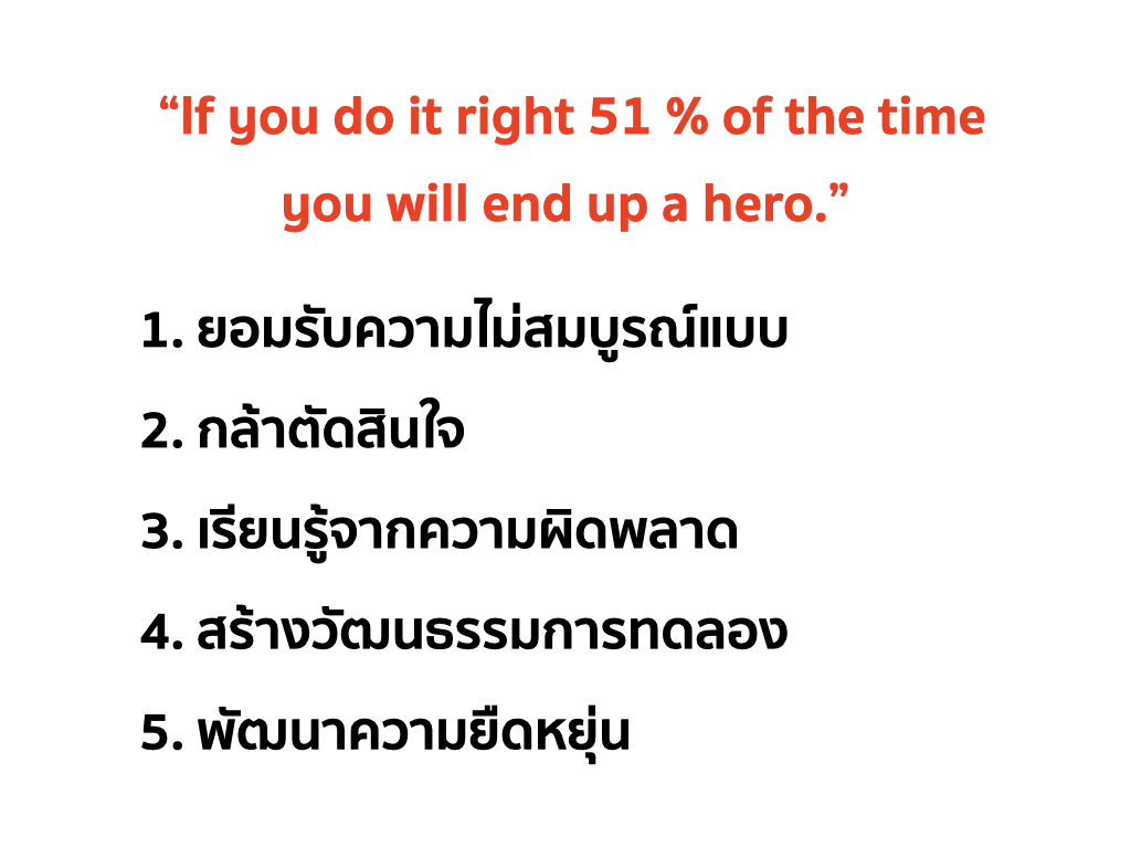 2. กล้าตัดสินใจ: ในสภาพแวดล้อมที่เปลี่ยนแปลงอย่างรวดเร็ว การตัดสินใจที่รวดเร็วและยืดหยุ่นมีความสำคัญมากกว่าการรอให้มีข้อมูลครบถ้วน