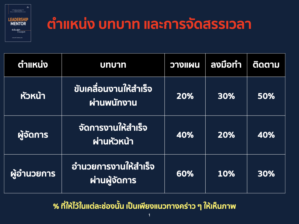 จำนวนเปอร์เซ็นต์ที่ให้ไว้ในตารางแต่ละช่องนั้นยืดหยุ่นได้ ไม่ต้องเท่ากับจำนวนนั้นไปทุกช่อง แต่ให้ไว้เพื่อเปรียบเทียบการจัดสรรเวลาของแต่ละระดับ เช่น หัวหน้างาน วางแผนน้อยกว่า ผู้จัดการ และผู้จัดการวางแผนน้อยกว่าผู้อำนวยการ ทั้งนี้ขึ้นอยู่กับบริบทและประเภทธุรกิจของแต่ละองค์กรด้วยครับ