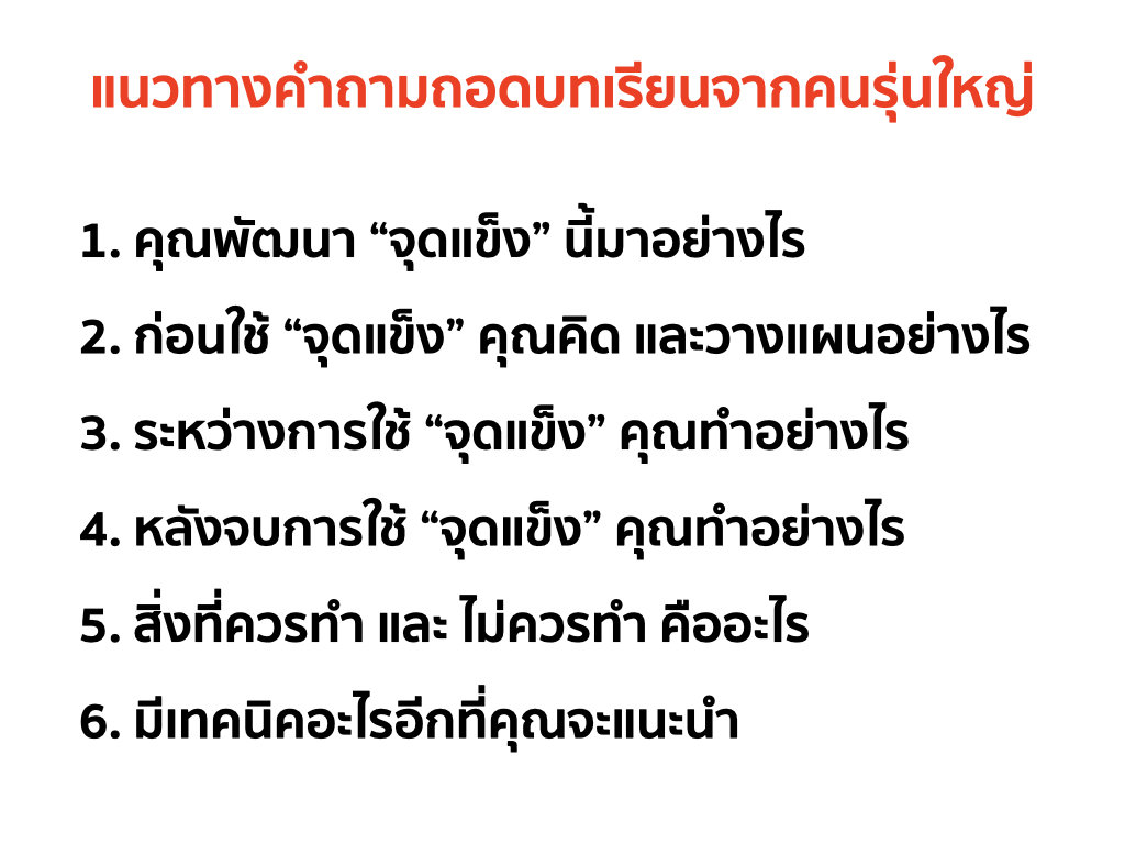 นอกจากนี้ ยังมีแนวทางคำถามถอดบทเรียนจากคนรุ่นใหญ่ด้วย คือ…