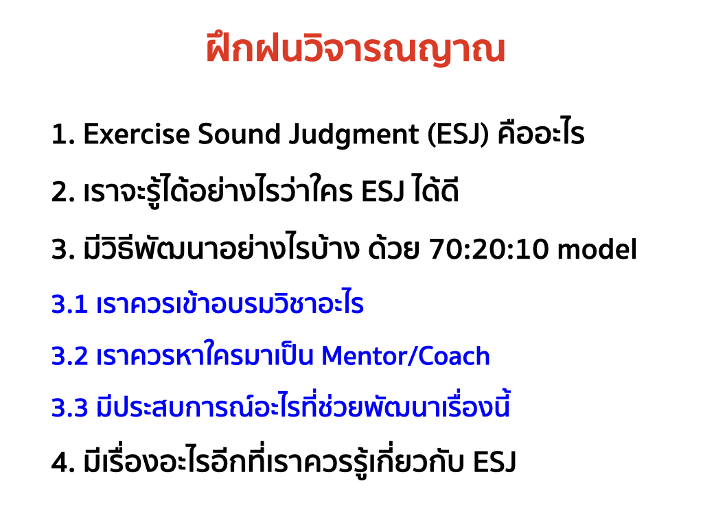 บทความนี้มุ่งเน้นไปที่การอธิบาย Exercise Sound Judgment ว่าคืออะไร วิธีการประเมินบุคคลที่มีทักษะนี้ และแนวทางการพัฒนาตามโมเดลการเรียนรู้และพัฒนา 70:20:10