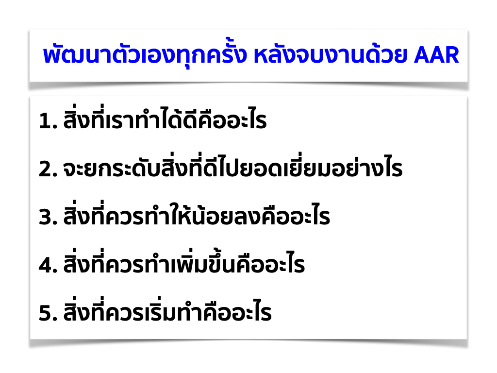AAR หรือ After-Action Review คือการทบทวนผลของการปฎิบัติการหลังจากจบงานทันที