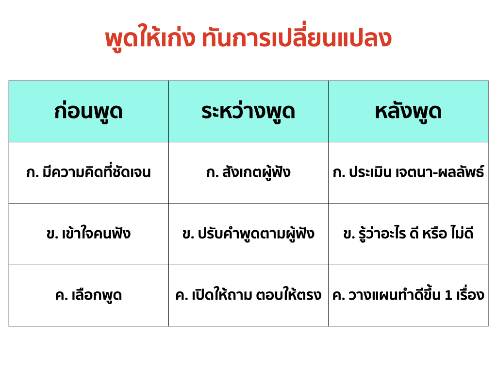 ฟังดูง่าย แต่ทำยาก เพราะต้อง ฝึกฝน และฝึกฝืน กับความคุ้นเคยของเรา โดยเฉพาะขั้นตอน “ก่อนพูด”