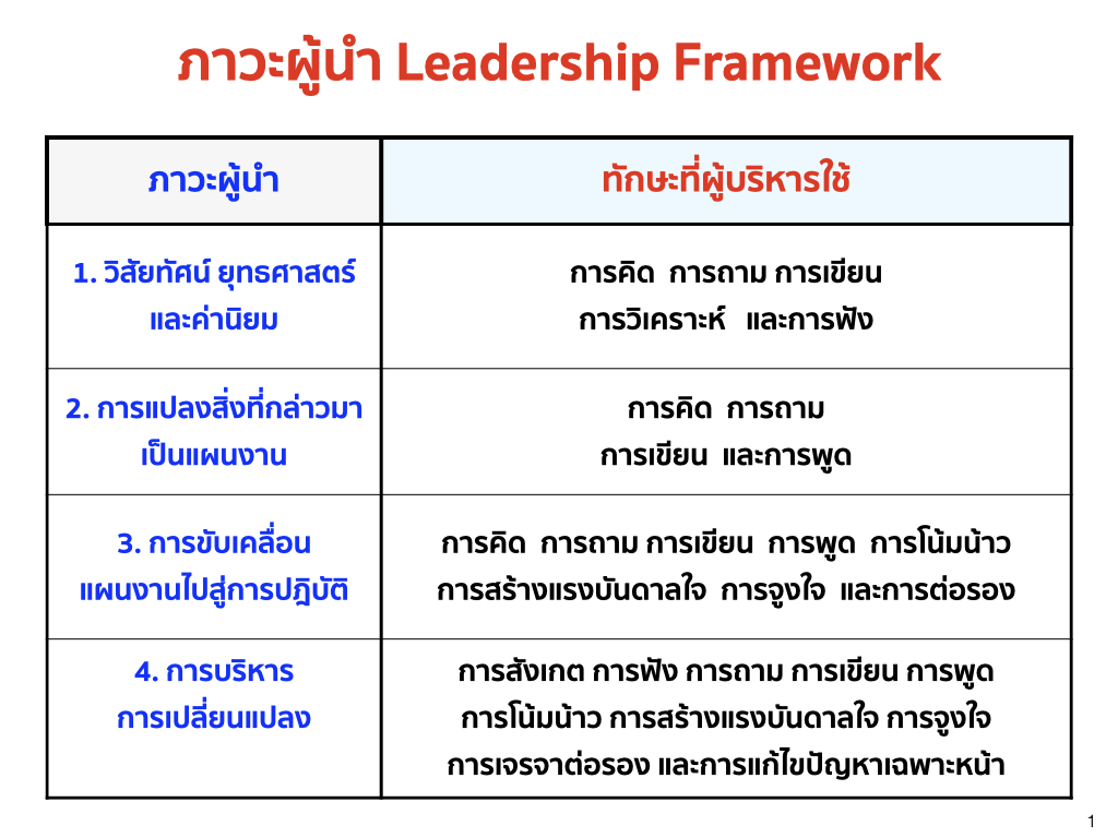 ผู้นำใช้ การคิด การถาม การเขียน การพูด การโน้มน้าว การสร้างแรงบันดาลใจ การจูงใจ และการต่อรอง