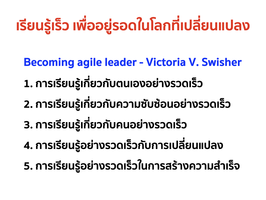 เร็ว ๆ นี้ผมไปงานเลี้ยงรุ่น และพบสุวัฒน์เพื่อนรุ่นเดียวกัน เขาทำงานบริษัทข้ามชาติแห่งหนึ่ง ได้บ่นให้ฟังว่ากำลังเครียดกับการเปลี่ยนแปลงในงาน ผมจึงแนะนำหนังสือ “Becoming agile leader” โดย Victoria V. Swisher ให้เขาอ่าน
