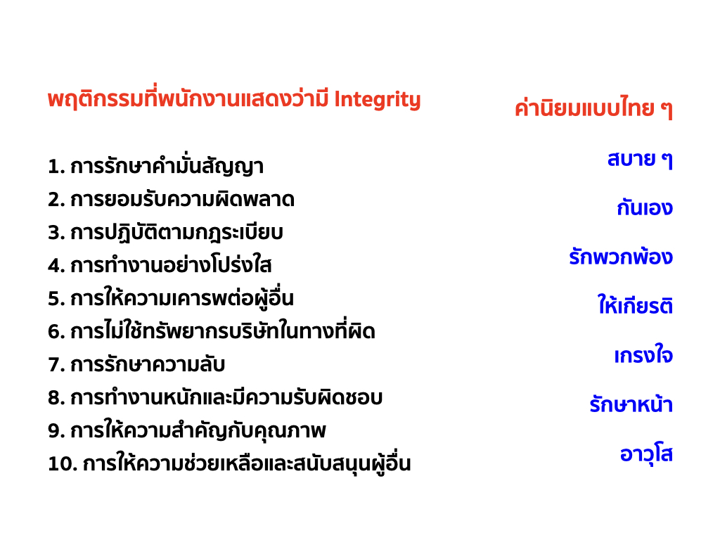 การยึดมั่นใน Integrity ต้องการความซื่อสัตย์สุจริตและการทำสิ่งที่ถูกต้อง ซึ่งบางครั้งอาจขัดแย้งกับค่านิยมแบบไทย ๆ ที่เน้นความสัมพันธ์และความเกรงใจมากกว่าความถูกต้องและความยุติธรรม