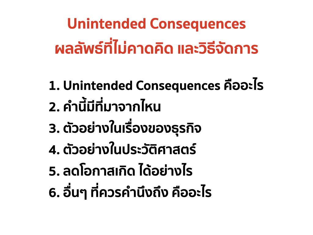 – Unintended Consequences อาจเกิดขึ้นได้ในทุกสถานการณ์ ไม่ว่าจะเกิดจากการกระทำของบุคคล องค์กร หรือรัฐบาล